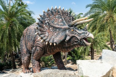 ไทรเซอราทอปส์ คือไดโนเสาร์ชนิดสุดท้าย ที่มีชีวิตปลายยุคท้ายสุด “ยุคครีเทเชียส”ราวๆ 65-68 ล้านปี เป็นไดโนเสาร์ขนาดใหญ่หนักราวๆ6-8 ตันและยาวกว่า 6-10 เมตร ปากมีจะงอยคล้ายนกแก้วไว้ตัดพืช โดยทั่วไปกินเฟิร์น สน ซึ่งเป็นพืชเนื้อหยาบและจะกลืนหินตามลงไปเพื่อช่วยบดอาหารในกระเพราะ หินนี้เรียกว่า “แกสโตลิท” เป็นสัตว์ที่กินมากเฉลี่ย 500 กิโลกรัม