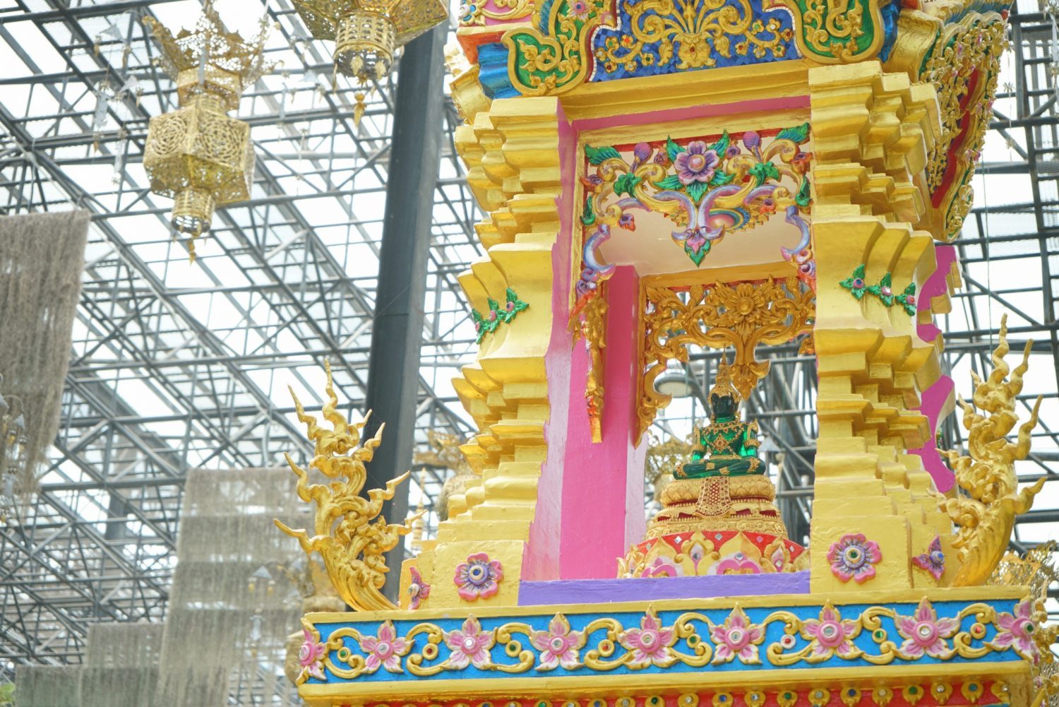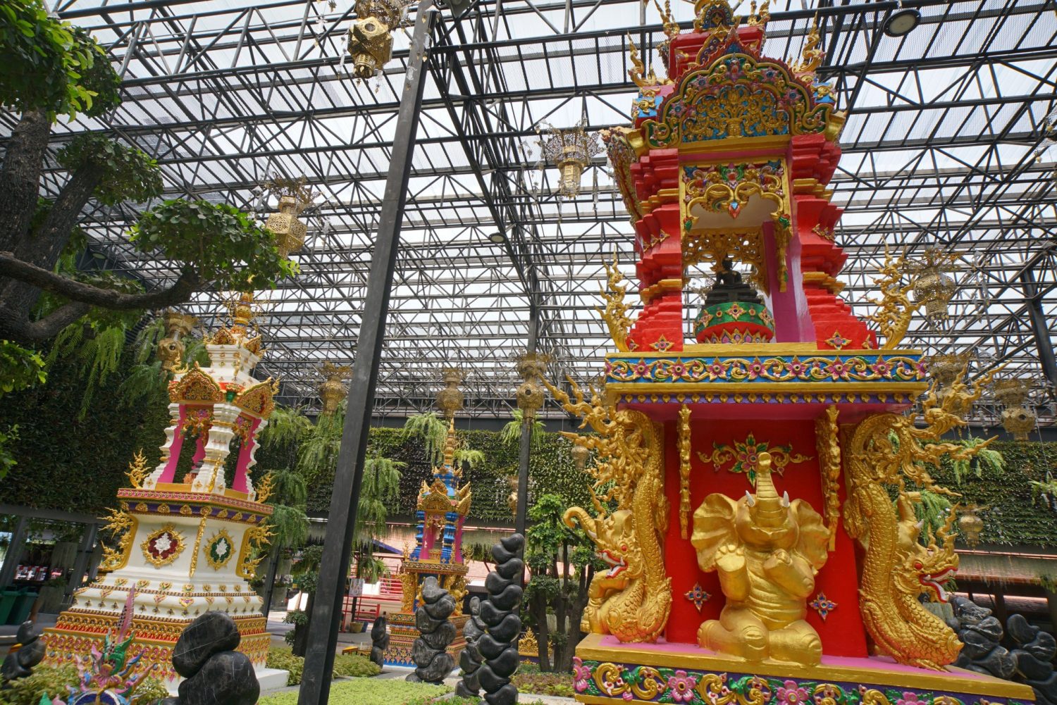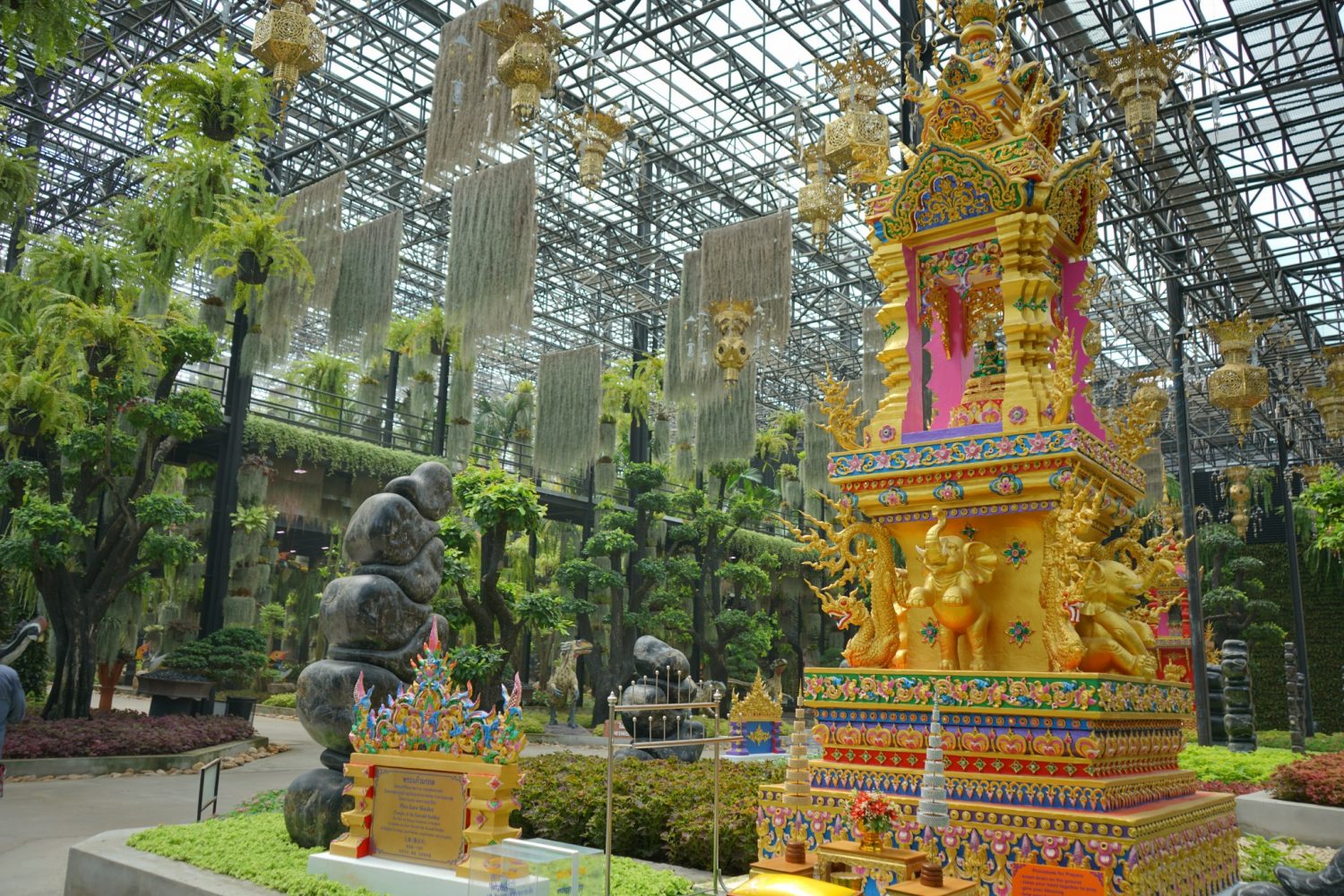 มาประดิษฐาน บนแท่นบุษบกอันวิจิตรงดงาม ในบริเวณพื้นที่ของสวนลอยฟ้า ที่มีการจัดประดับตกแต่งด้วยต้นไม้ในพระพุทธศาสนา เช่น บอนไซ ตะโก ไม้ดอกหลากหลายชนิด ฯลฯ