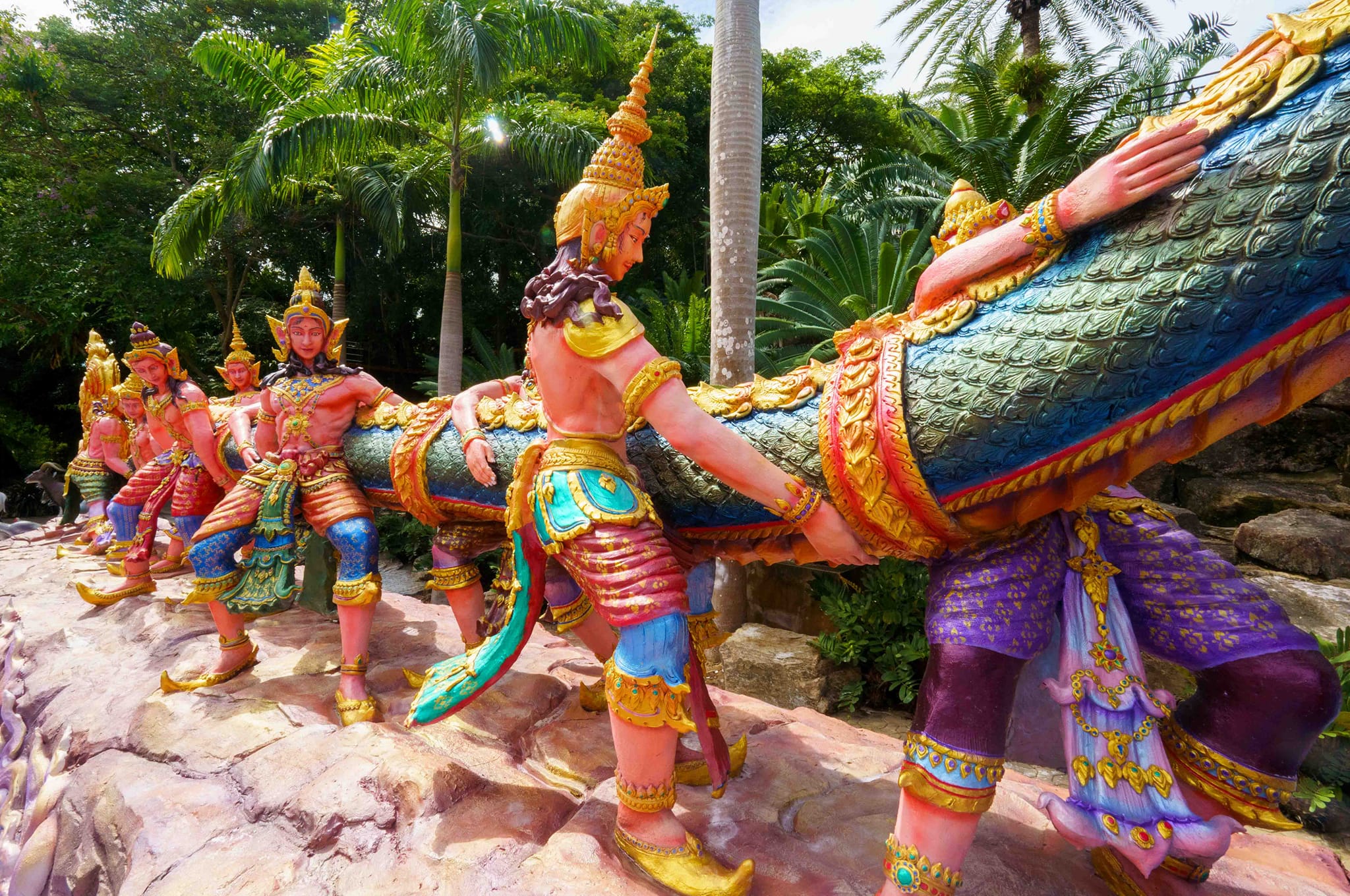 ตำนานกล่าวว่า เทพกับอสูรมักจะสู้รบกันเสมอๆ ต่างก็ผลัดกันแพ้ผลัดกันชนะ จนเหล่าเทพตายลงเป็นจำนวนมาก พวกเทพจึงมาขอให้พระนารายณ์ช่วย ท่านจึงให้ทำการกวนเกษียรสมุทรเพื่อจะได้มีน้ำอมฤตมาให้พวกเทพได้ดื่มและจะได้มีชีวิตเป็นอมตะ แต่การกวนเกษียรสมุทรซึ่งเป็นงานใหญ่ ต้องให้พวกอสูรร่วมมือด้วย จึงมีการเจรจาพักรบกันชั่วคราว โดยฝ่ายเทพหลอกว่าจะให้พวกอสูรได้ดื่มน้ำอมฤตด้วย