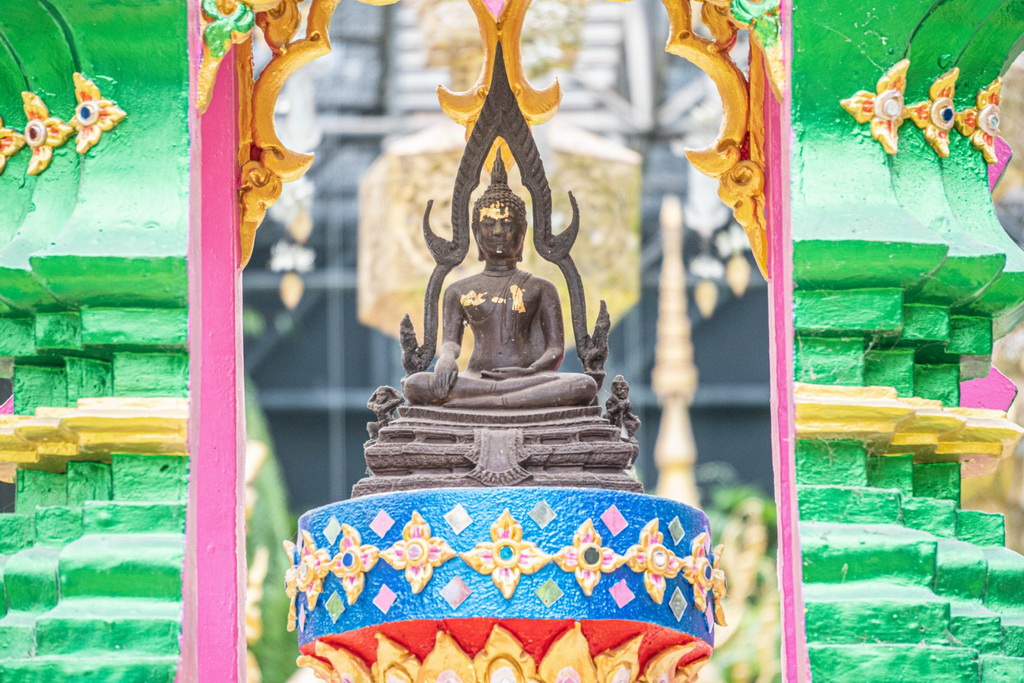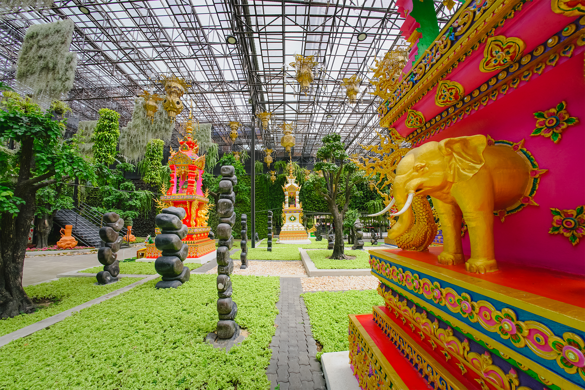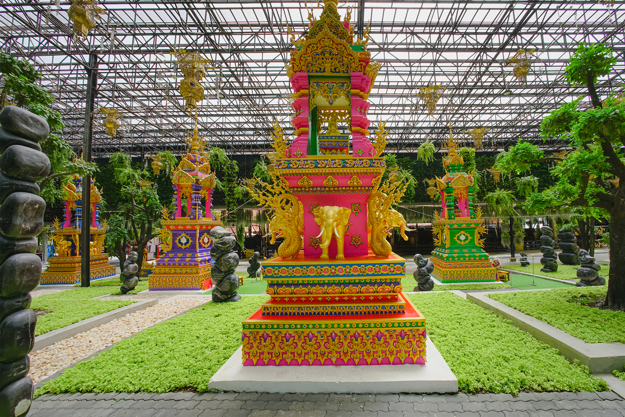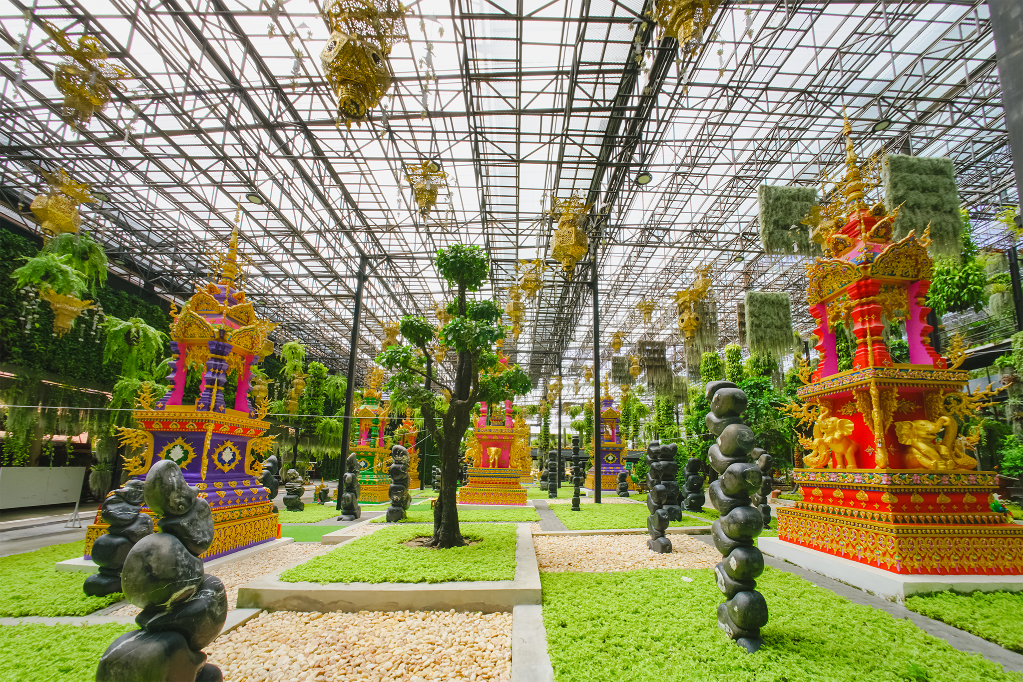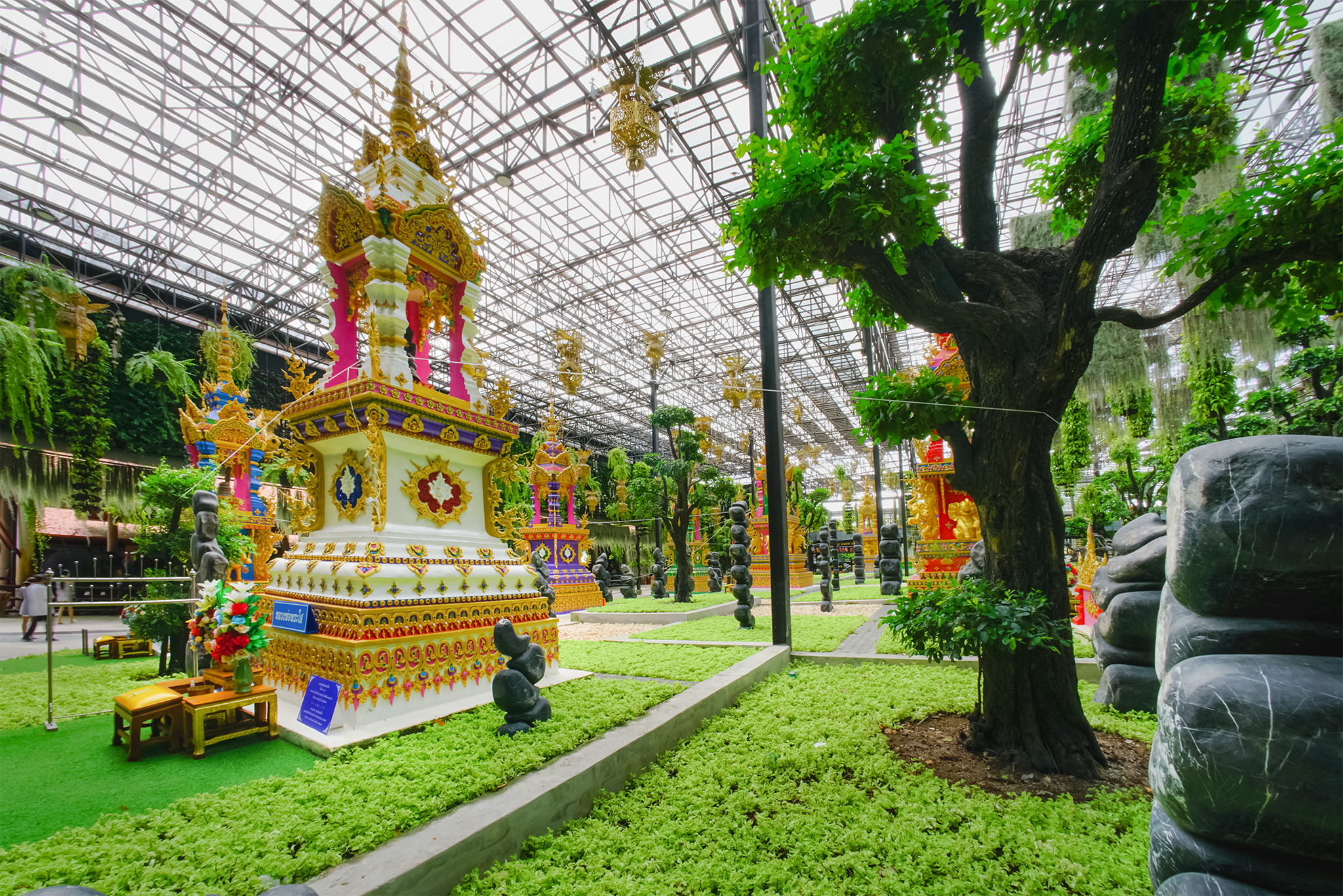 ทั้ง 9 พุทธปฏิมากร ได้ประดิษฐานบนแท่นบุษบกอันวิจิตรงดงาม ในบริเวณพื้นที่ของสวนลอยฟ้า ที่มีการจัดประดับตกแต่งด้วยต้นไม้ในพระพุทธศาสนา เช่น บอนไซ ตะโก ไม้ดอกหลากหลายชนิด