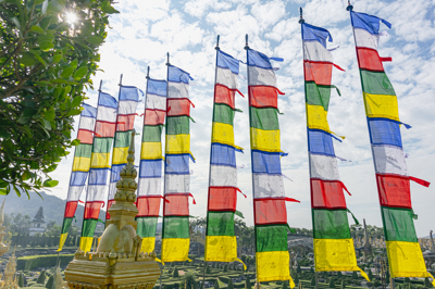 ธงมนตรา เป็นธงที่ทำจากผ้าทอไหมผืนบาง ๆ จารึกบทสวดมนต์ไว้บนธง ธง 5 สี หมายถึง 5 ธาตุ ซึ่งจะพัดผ่านสายลม นำสิ่งดี ๆ มาสู่ชีวิต ประกอบด้วย