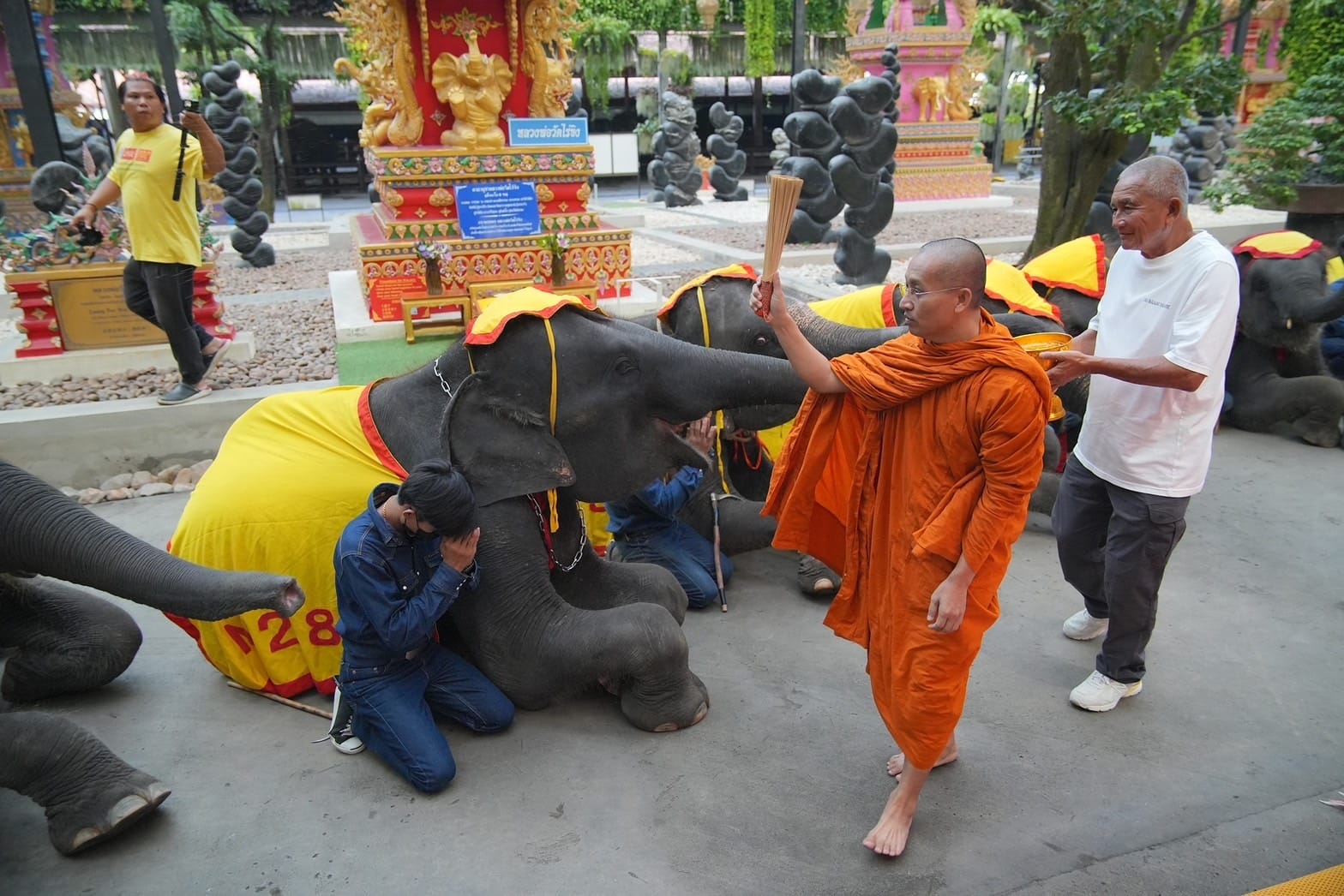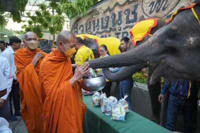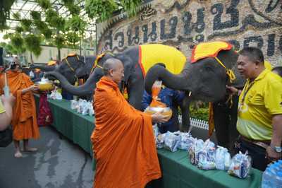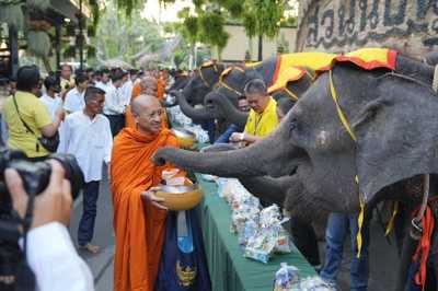 จัดพิธีทำบุญตักบาตรพระ 9 วัด 19 รูป และนำน้องช้าง 9 เชือกร่วมพิธี