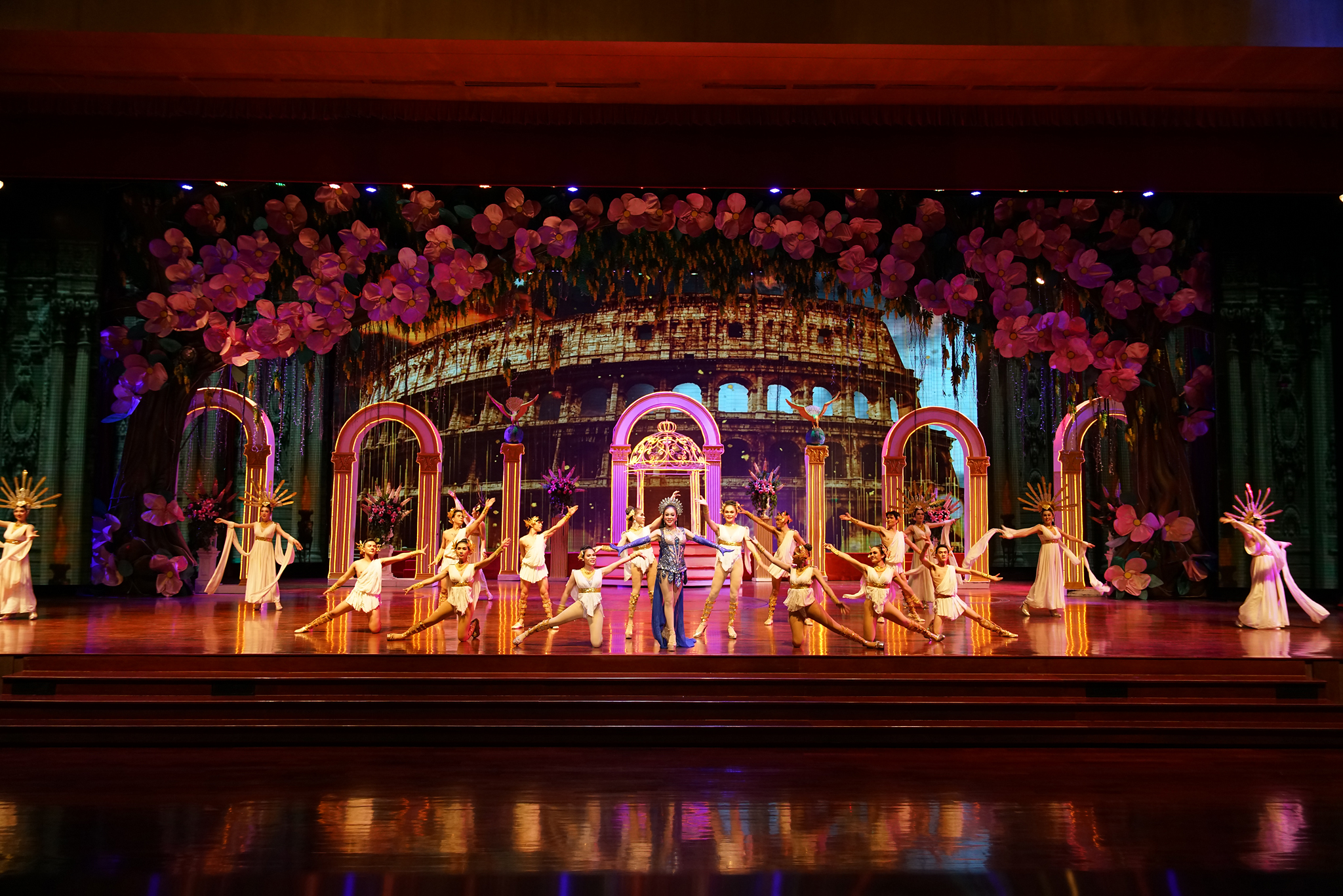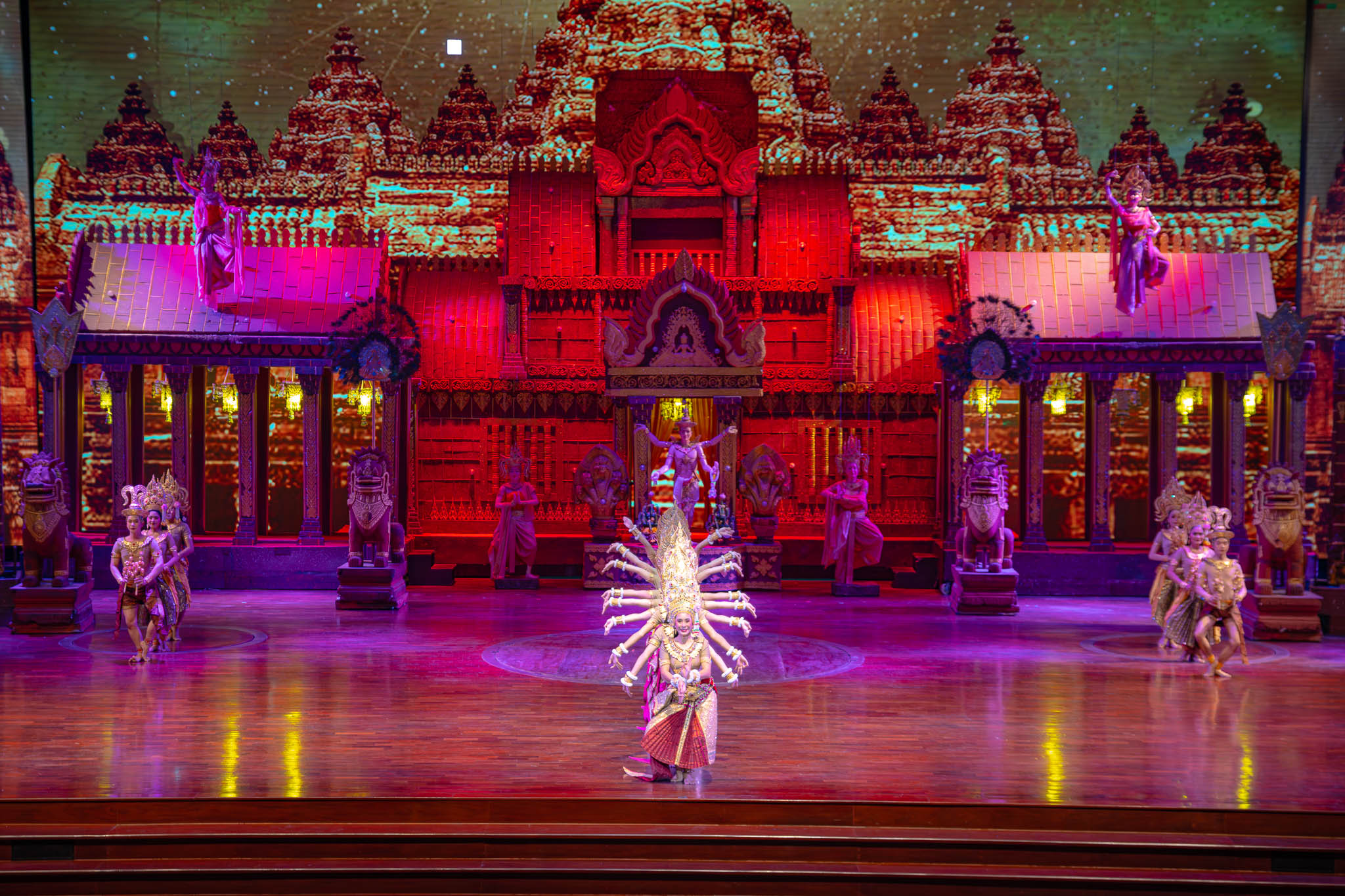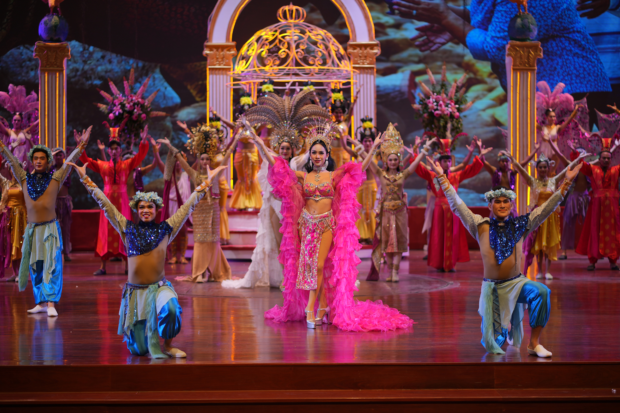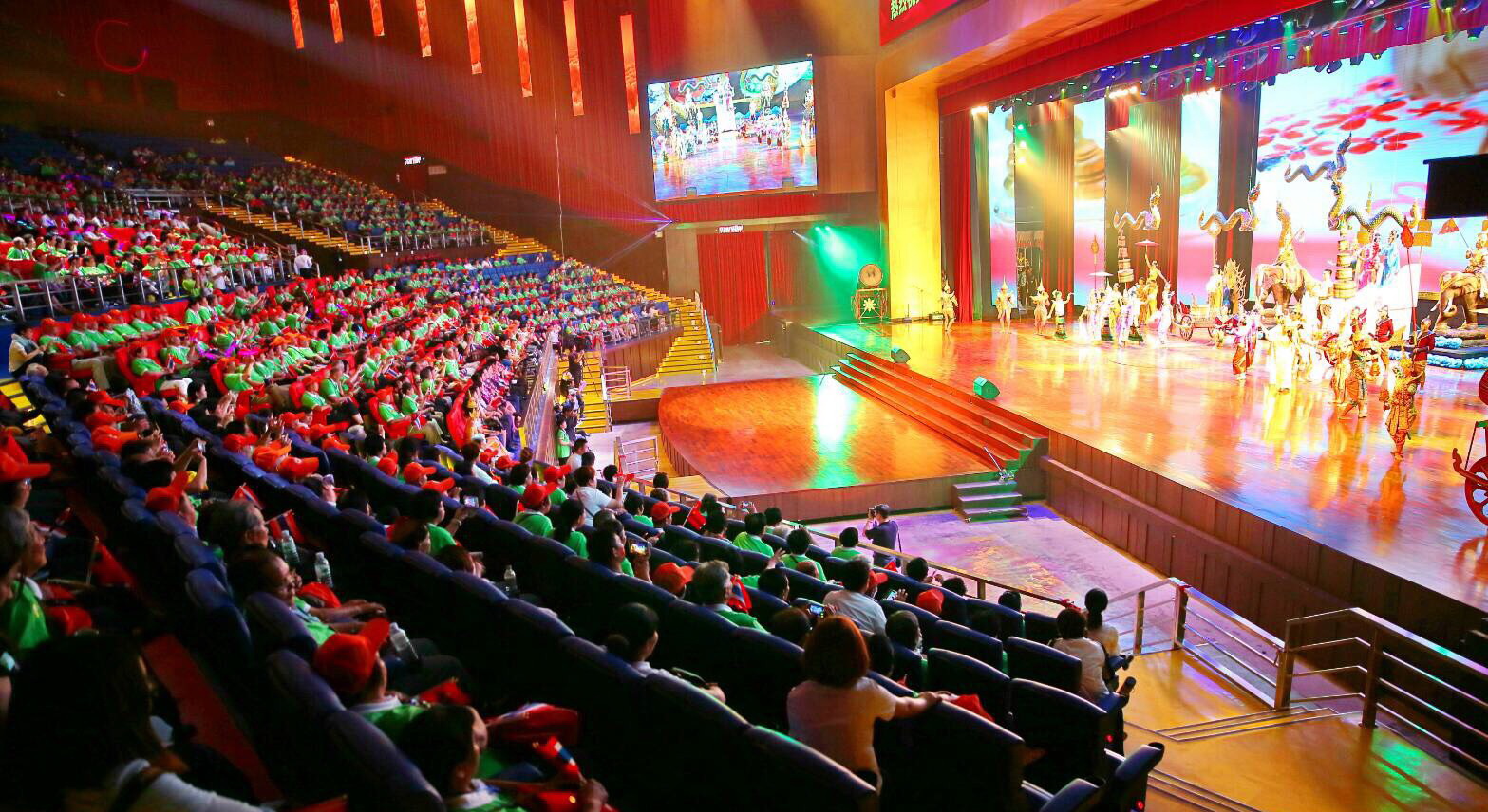 ม่านเวทีอันสวยงามถูกเปิด ชมความงดงามของการแสดงศิลปวัฒนธรรมไทยร่วมสมัย สนุกสนานด้วยระบำกลองยาว ลีลาสุดอ่อนช้อยด้วยท่าร่ายรำระบำสี่ภาค ระบำเทพนฤมิต สลับฉากหลังอันยิ่งใหญ่ตระการตา ต่อด้วยศิลปะการต่อสู้ที่เข้มแข็งดุดัน พร้อมโชว์พลังมหกรรมกลอง ปิดท้ายด้วยการแสดงศิลปะการต่อสู้เชิงประวัติศาสตร์ที่เลื่องลือยุทธหัตถี นำแสดงโดยช้างแสนรู้ สู้รบบนเวทีของโรงละครมาตรฐานระดับโลก ที่คุณต้องตะลึง