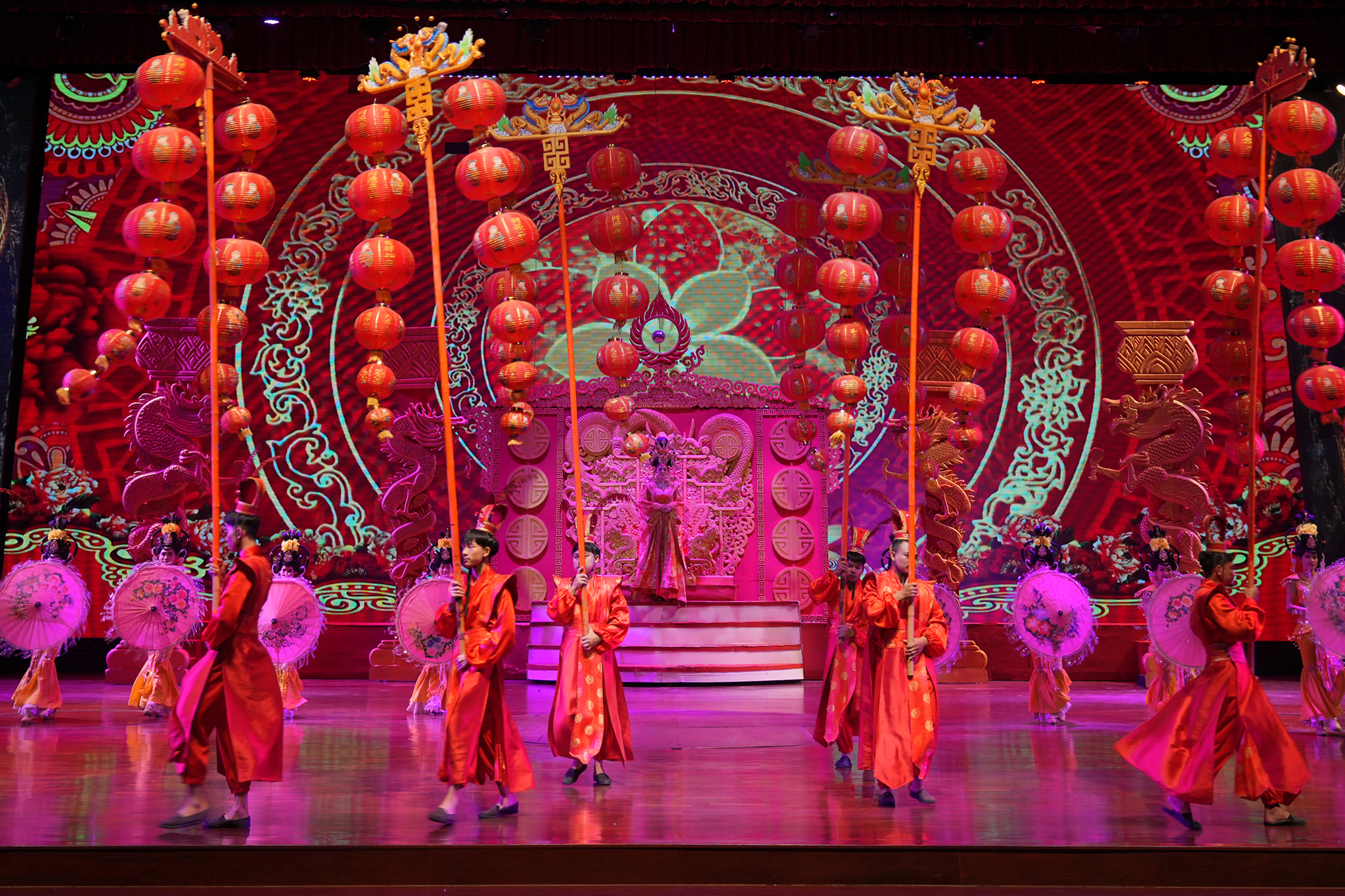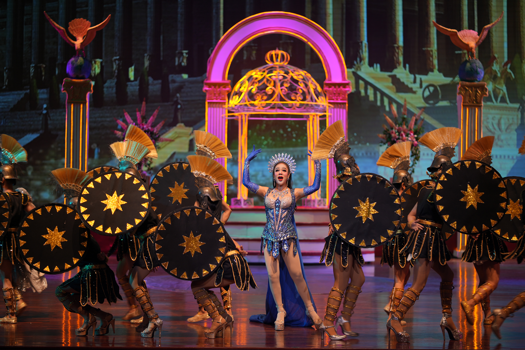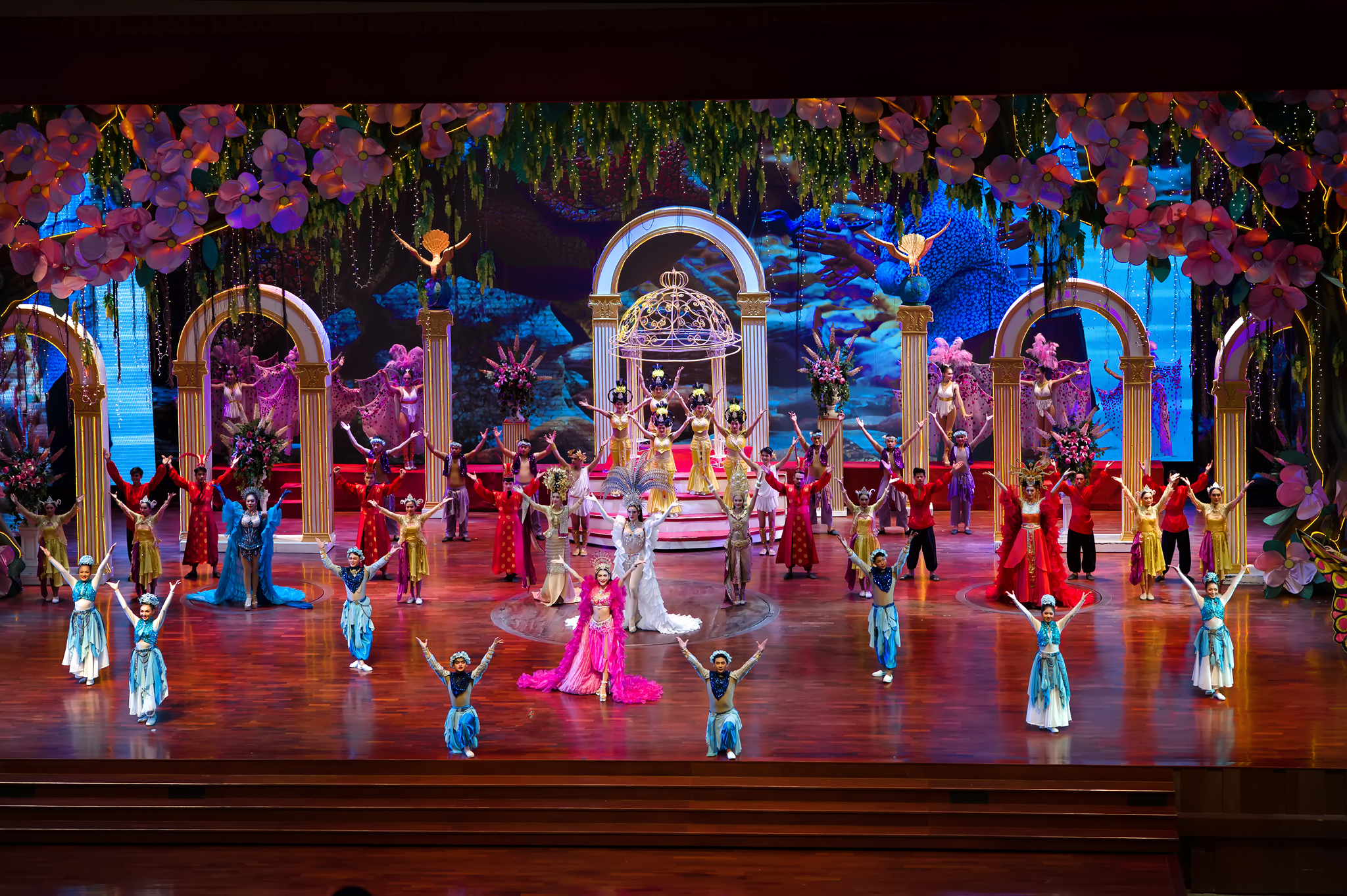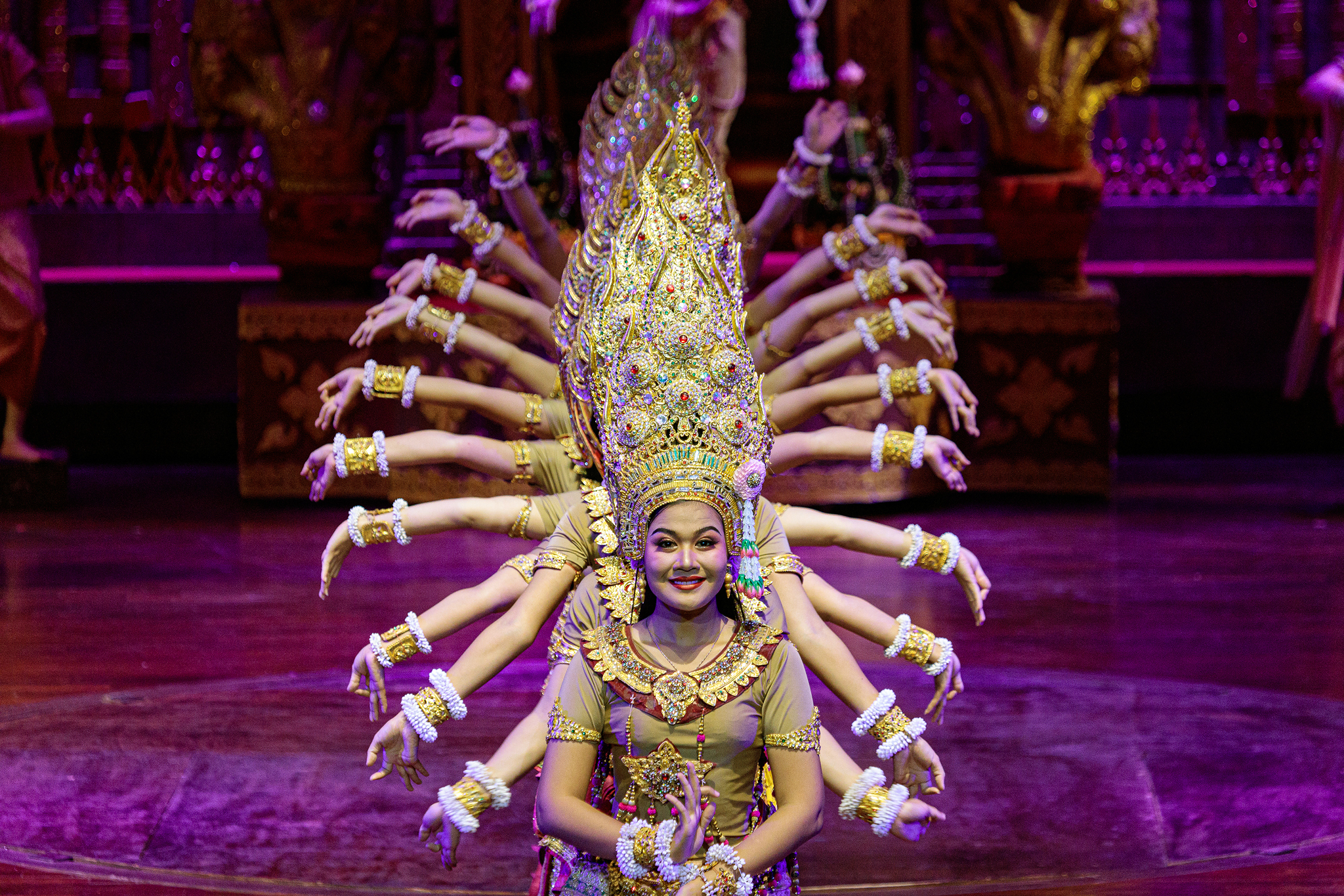 ม่านเวทีอันสวยงามถูกเปิด ชมความงดงามของการแสดงศิลปวัฒนธรรมไทยร่วมสมัย สนุกสนานด้วยระบำกลองยาว ลีลาสุดอ่อนช้อยด้วยท่าร่ายรำระบำสี่ภาค ระบำเทพนฤมิต สลับฉากหลังอันยิ่งใหญ่ตระการตา ต่อด้วยศิลปะการต่อสู้ที่เข้มแข็งดุดัน พร้อมโชว์พลังมหกรรมกลอง ปิดท้ายด้วยการแสดงศิลปะการต่อสู้เชิงประวัติศาสตร์ที่เลื่องลือยุทธหัตถี นำแสดงโดยช้างแสนรู้ สู้รบบนเวทีของโรงละครมาตรฐานระดับโลก ที่คุณต้องตะลึง