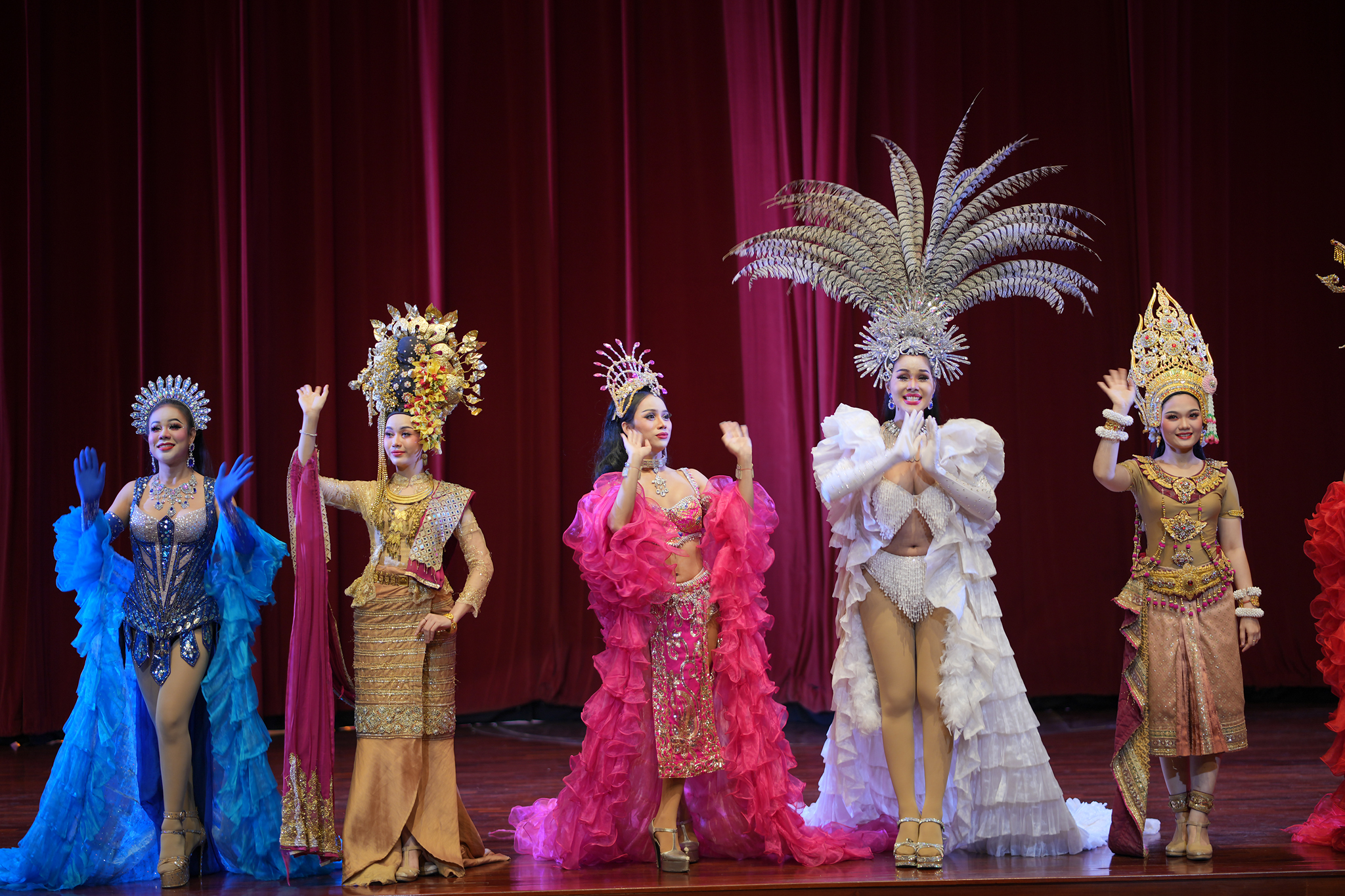 ความเด่นของเหล่านางรำ ไม่ใช่แค่เพียงท่าทางที่อ่อนช้อยสวยงามเท่านั้น หากแต่ชุดที่สวมใส่ของแต่ละการแสดงนั้น ได้รับการตัดเย็บที่ประณีตสวยงาม ด้วยการปักลวดลายต่างๆ ส่องแสงระยิบระยับทุกการแสดงในภาคต่างๆ ล้วนแล้วนำไปสู่ความยิ่งใหญ่เมื่ออดีตกาลอย่างชัดเจน เป็นการแสดงถึงศิลปวัฒนธรรมร่วมสมัยที่สมบูรณ์ สวยงามและสง่าที่สุด