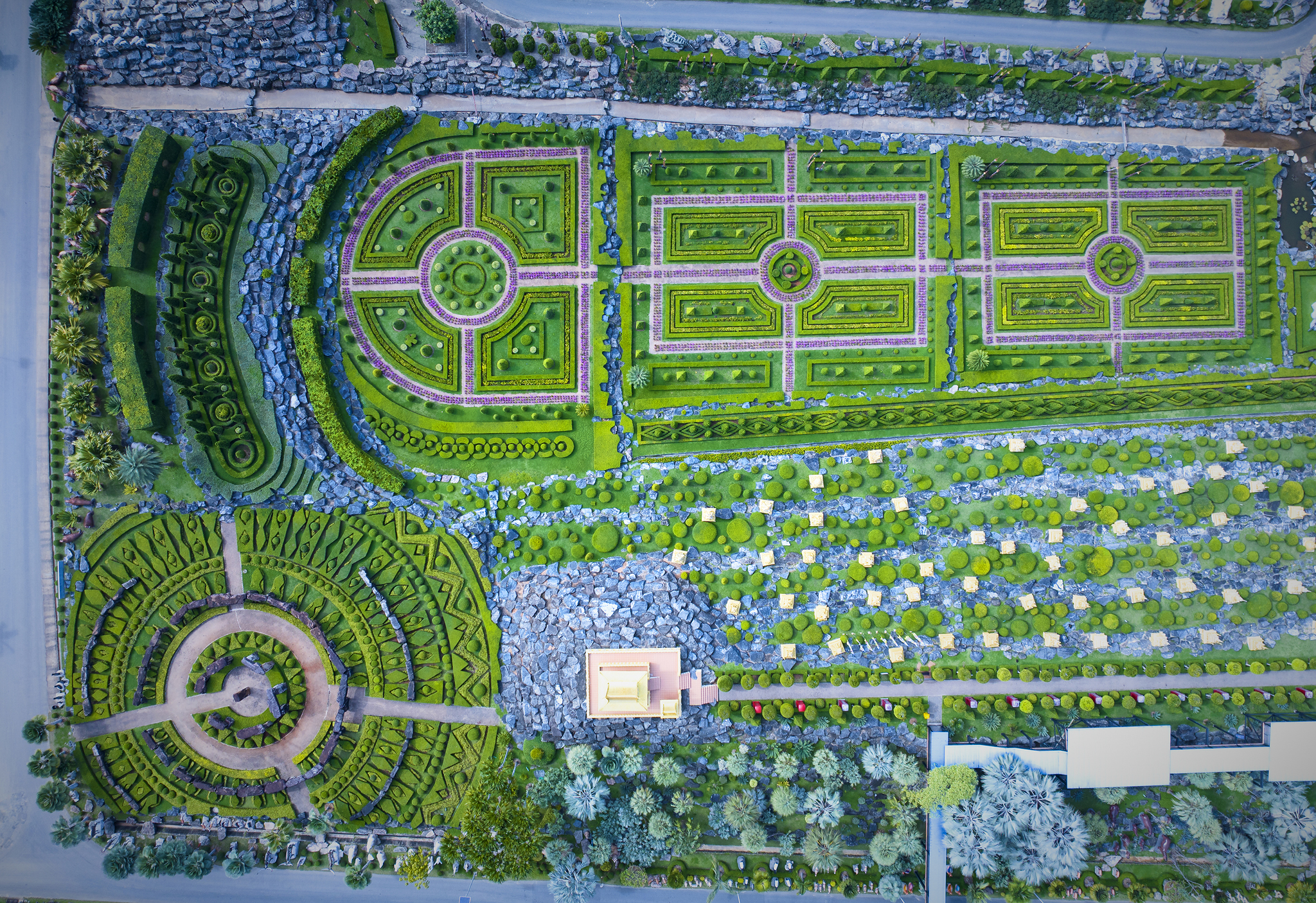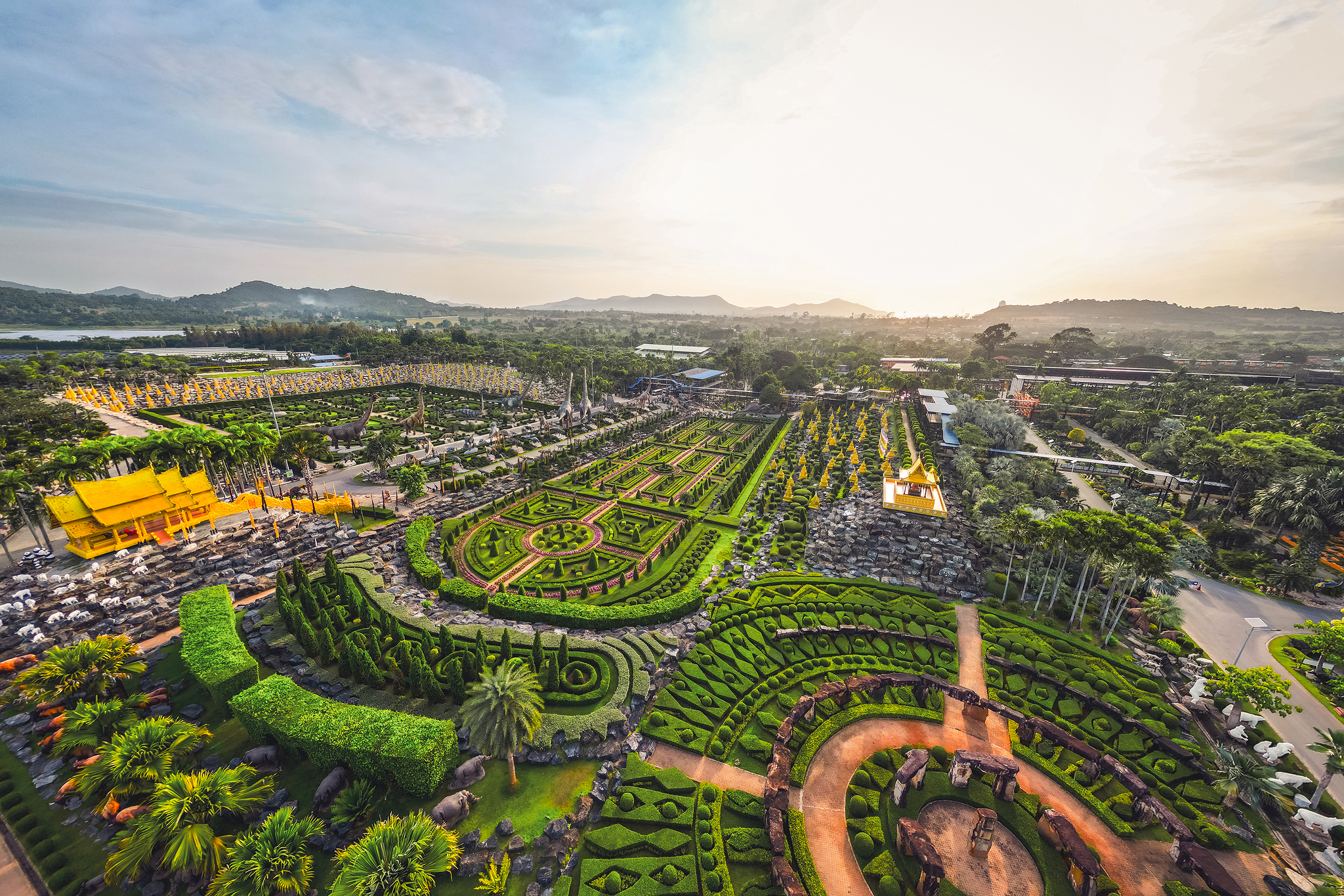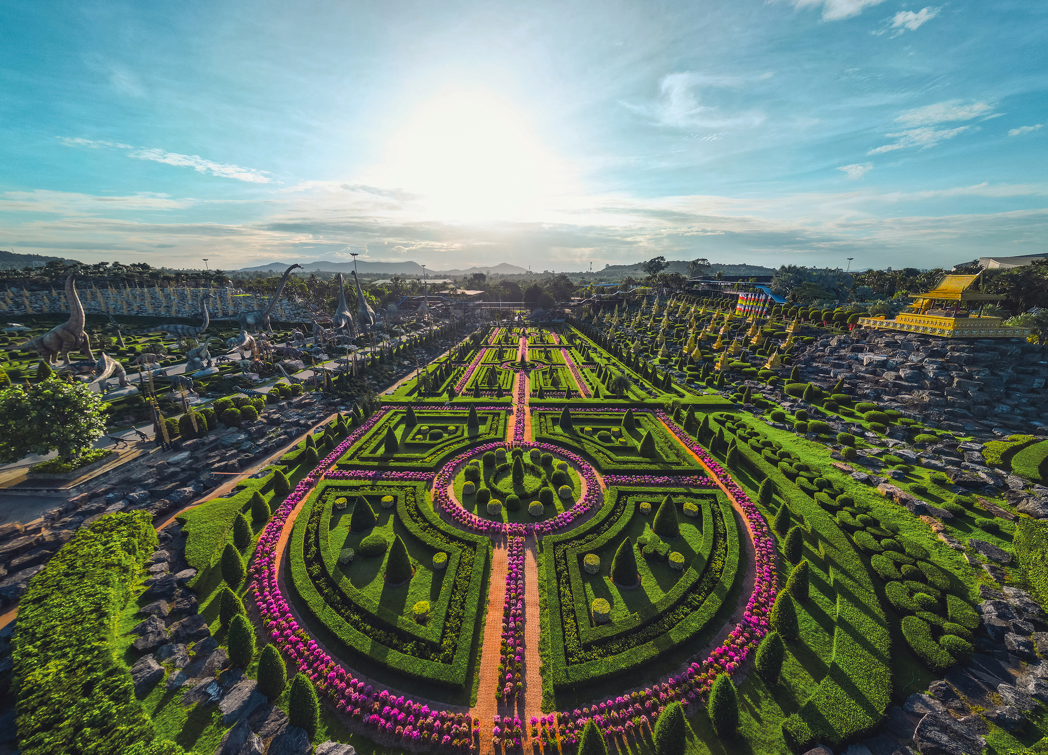 1996-1997年,东芭乐园扩大蓄水面积,以供增加使用,从而将湖的范围挖得更大更深,因此有大量土壤堆积成小山丘。起初,用作向日葵田。直到 芭提雅东芭乐园 的总裁 陈忠先生,从凡尔赛宫后面的法式花园中得到了这个几何花园的想法。于是,他开始建造这座花园。历时近2年,1998年对游客开放,后来又添置了各种建筑,使之更加美丽,如佛塔复制品、雕塑、泰国文学中的11个故事等,并设立了来自英国的红色电话亭等。让这个地方成为美丽、充满生机的大自然色彩。