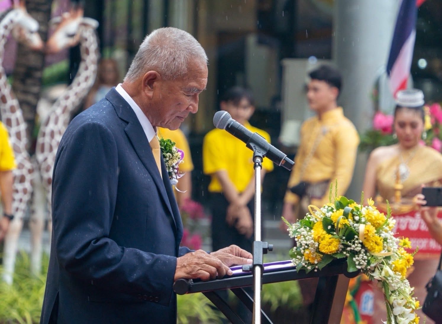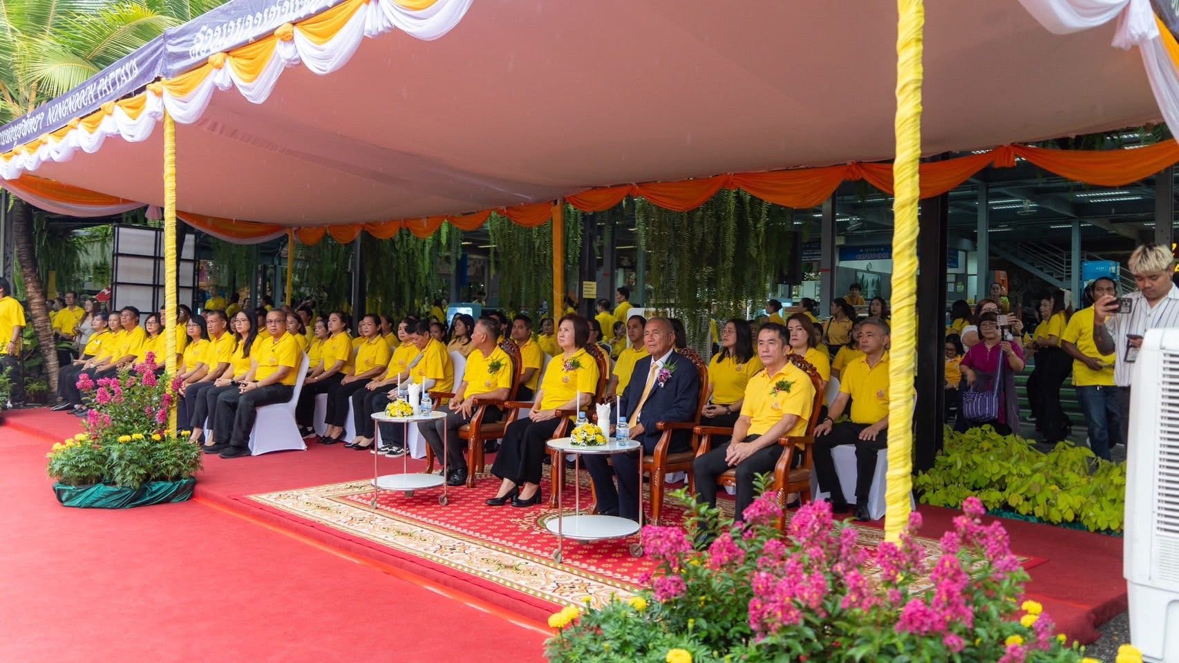 The ceremony commenced with a majestic procession titled “Glorious Homage to His Majesty King Vajiralongkorn,” marking the largest gathering of staff and elephants for such a tribute. Mr. Kampon Tansacha presided over the ceremony, presenting golden and silver floral offerings and leading the royal homage by offering floral tributes. He also led the recitation of royal praises and the collective chant of “Long Live the King” to express heartfelt blessings.