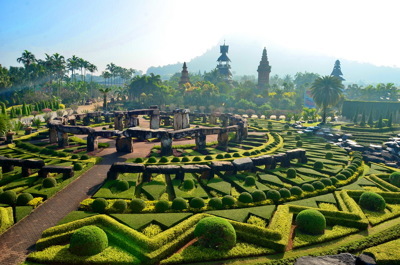 其次神殿,吉祥殿的后是仿似英国的巨石阵。在巨石阵后是仿造4种不同国家建筑风格的塔楼包括有老挝、缅甸,泰国兰纳时代和印度尼西亚巴厘岛风格建筑设计,花园和仙人掌花园之间有一座桥。沿途装饰有动物雕像,包括白老虎,斑马,猫头鹰,袋鼠等。